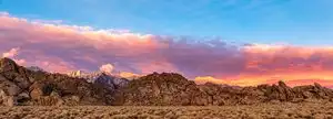 Alabama Hills is a premiere Hollywood Movie and Commercial Location. Many movies have been filmed here as early as the early 20's, with such as Gunga Din (1939), and Django Unchained (2012), where director Q. Tarantino and crew, used many of the local businesses of Lone Pine. The Hills also provide many recreational areas for hiking, mountain biking, bouldering, Jeeping, photography, and camping. There are no camping fees there, but check with local authorities about camp fires, and the use of camping stoves, a permit is needed. There are no restrooms there, so plan accordingly, and don't forget to pack out your trash. The Hills also provide panoramic views of the Sierra Nevada mountain range, including the tallest summit of the contiguous United States, Mount Whitney (14,505 ft). Alabama Hills / Lone Pine is about a 3.5hr drive from the Los Angeles area, and a great base camp for exploration of the Owens and Death Valleys. This is my favorite weekend getaway location.