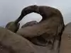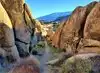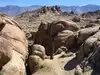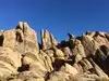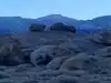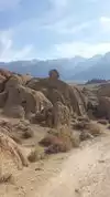 Hills that have decomposed into wild boulders, loaves, spires and mesmerizing shapes, most viewable from the car. Hikes are short and have a high return on investment. Getting the free Alabama Hills map at the visitor center on the S side of Lone Pine on Rt 395 is worth it because the multitude of side roads are not labeled. The roads are not paved, but they are in good shape. If you go on a walkabout, wear sunscreen, sensible shoes and a wet bandana if it is between 10 AM and 4 PM because it is HOT. From the road to Whitney Portal, turn right onto Movie Road.