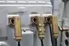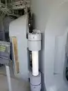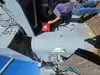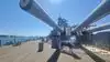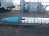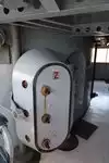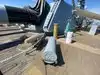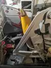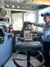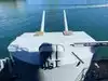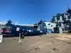 A toilet truck is in front of the ship, usable and clean.