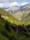 Hiking up to Bear Creek Falls is a perfect first hike for anyone visiting Telluride. That said, I still love this hike after decades of hiking, and I return to it like a pilgrimage probably every other year now. You walk up above the town, which is a view not to be missed, and slowly the town disappears as you hike up. The hike is on an old road, so there is no technical difficulty aside from trying to breathe at altitude and walk uphill! It's a beautiful, beautiful journey, with the sound of the creek next to you and the walls of the mountains on either side. The falls is a great place to cool off your feet and rest before the trek down.