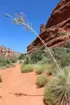The pathway is a dirt pathway and sometimes is on a rock mountain edge but fairly easy path. Many signs to guide you on the right path or suggest other hiking trails in the area. You still should pay attention to your directions and notice landmarks to help you return to your car. Many cactus and spring flowers were blooming. You can walk as long as you like, long or short. Great colors of the red rocks and blue sky. Remember to take some water and snacks if you stay out awhile.