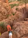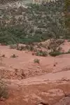 The way down to the halfway point was tricky, easier for people with long legs since they can reach the crevice and foothold easier. Hard to find the trail that I came up, but I dis stop to admire the rock formations, red sandstone against the green vegetation.