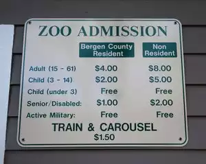 The zoo is $4 or $8 for adults ages 15-61, $2 or $5 for children 3-14 for bergen county residents and non-residents respectively. Active military are Free. Children under 3 are also free.