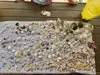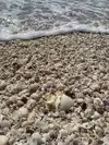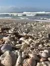 Beautiful beach with sea shells scattered everywhere. My kids discovered larger shells farther from the crowds as they walked along the beach, washing up onto the sand.