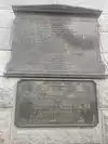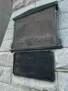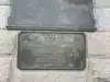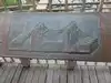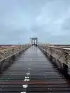 The wooden walkway the whole iron structure with arches in the center with signs describing its history