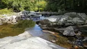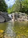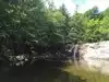 My nephew from Vermont took us to this great swimming hole. It was very hot this year in Vermont and this was a welcome break. The water is very cold and the area in and around the water is very rocky you will be lost without some type of water shoes. There was a safe place to jump off a rock cliff into the water if you are able to scramble up the side. There is a small waterfall you can stand under for fun. Maybe hard to find ask a local.