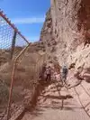 The first part of the trail is loose sandy gravel but is relatively easy until you arrive at the stairs. The stairs aren't too bad, but watch your head so you don't hit it on the rock to your right. I've done that and it hurts like the dickens, so please learn from my mistake ;). Now - my wife went ahead of me and upon reaching the top of the stairs she looked around the corner and said it was mostly flat for quite a while -- she didn't look far enough, because next is the first rail and it is more vertical than flat. Many people were grabbing onto the fence or rail -- I tried to go up the right side on mostly all 4's and, with a couple slips in for good fun, made it to the top. From there it continued to be as much scrambling as hiking until you reach the summit.