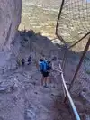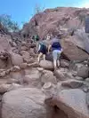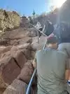 After the steep hand rail section, there's a brief easy section. Not flat but easy. Then you start scrambling up several chutes of large rocks. Most people use they hands and feet. Be careful. The rocks are coarse and a slip here will leave a mark.