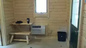 Pros: A/C!! It worked great and was a godsend at night. The cabin was surprisingly spacious. The chairs outside were awesome under the little covered porch. Campsites there are very private.