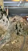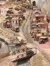 The layout uses N-gauge (9mm) track. The modeling is exquisite, the labor of a lifetime by one dedicated guy.