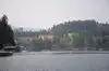Lake is a pretty blue surrounded by lots of trees. There are a few places to eat and some large hotels.