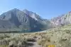 There is a 2.5 mile trail all the way around Convict Lake, which lies just 15 minutes south of the resort town of Mammoth Lakes. The trail is mostly flat, which is nice for those unaccustomed to the 7580 foot altitude. The north side of the lake is exposed and sunny, while the west end has an aspen forest, with a long boardwalk to cover the inlet streams. The fall colors are great here. The north lakeshore rises steeply to the summit of Mt Morrison at 12,277ft, and is often in shade. There is a road with adjacent walking path for one half mile along the south and southeast end. Look for ideal slate skipping stones here on the small beaches. Parking may be limited on a busy day.