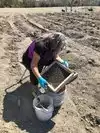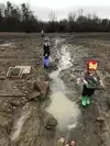 The field itself is extremely muddy and it can be hard to walk in spots. If bringing a wagon, make sure it has heavy duty wheels. Bring boots and clothes you don’t mind getting dirty. If coming on a cold day, bring rubber gloves, which will keep your hands from going numb when wet sifting. There is a hose station where you can wash off your boots and tools that will be caked with mud.