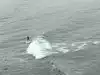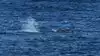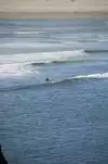 Close up and personal. Saw several spouts very close, and a bit of their shining black bodies folding back into the kelp bed. Quite close to the path. May have been a smaller one as well. Twice saw a pectoral fin rise out of the water most of the way. The sea was quiet so no big waves bursting out of the punchbowl, but it was a beautiful day, and the surfers were doing the best they could with a calm sea.