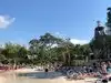 There were also plenty of loungers, thought not always in the shade. I considered renting an umbrella and Iām glad we didnāt spend the extra money. It wasnāt necessary. There was plenty of shade in the park. Tons of dining areas under roof.