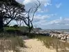 Lovely spring day when we walked in to this beach. (Unmarked, near the northeast tip of the island - ask the locals.) Parking free alongside the road. Hundreds of busy little land crabs at work under the sandy path and in surrounding marsh. Walk from road to beach is easy and short. The beach is very cool. Over the years, the beach has eroded leaving behind trees that have turned to "driftwood". All long the beach, these trees create endless photo opportunities and also many little semi-private nooks for laying down your beach towel. Beach is flat and hard therefore bike-able. Very pretty spot.