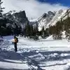 I have done this hike several times. You get three cool lakes (Nymph, Dream, & Emerald) on a 3 to 4 mile round trip hike with 600 feet of elevation gain. In winter and early spring this is a great snowshoe hike. You can rent snowshoes in Estes Park. Bear Lake Road is plowed. The path is well-trodden and easy to follow and is spectacular with all the snow. It's pretty cool to walk over the frozen lakes. In late spring the lakes are melted out but there is a lot of snow around them. It's beautiful in summer and fall as well. Get to the parking lot early or use the shuttle during summer and fall.