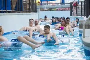 The place was just too packed to be enjoyable. I have teens and also a young child that’s 4. The teens didn’t like it because the lines were so long and the Flowrider was completely taken over by large group of young adults (and a few older ones too) who were drinking and riding. This completely made it unusable for just about everyone else. The pool area was too rowdy for my 4-year-old to safely get in, plus it’s very small so when teens are playing basketball there isn’t much room for anything else. The lazy river was fine until a huge band-aid floated by us. Gag. Forget about getting a tube for the lazy river. There are about 7 tubes for 1000 guests to use. The kid area has 3 little slides but the place was so packed with no adult trying to keep order and utter chaos. Once a large group of about 80 (not a joke) kids piled into 2 tables next to us, with 4-5 adults, and started taking the chairs at our table, we were done. Rudest group of grown women I’ve met! Entitled jerks.