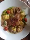 The ladies in our party hard the halibut which was baked with a sweet potato purée which they raved about. A special pasta with shrimp was offered and when the diner asked if a chicken substitute would work there was no hesitate to accommodate and he said it was delicious. My choice was a baked chicken breast atop a very light handmade pasta that was exceptional, tiny tomatoes and basil were also part of the dish, fabulous to say the least.