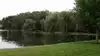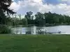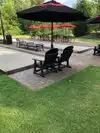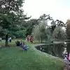 Outdoor seating with nice evening live music and walk up ordering with server delivery located on the banks of a large pond: a great place for a relaxing evening in summer.