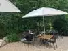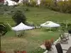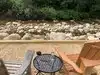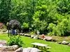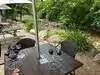 Relaxing , sitting next to babbling brook. If you prefer shade, many tables and chairs under pergola. Grapes still in the vine but probably for another month!