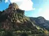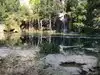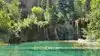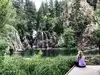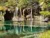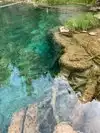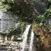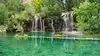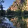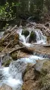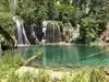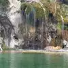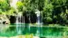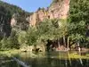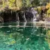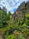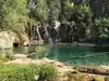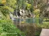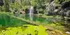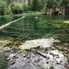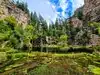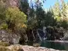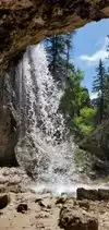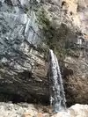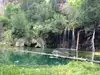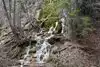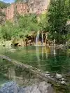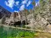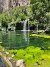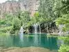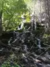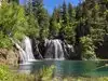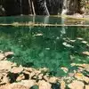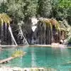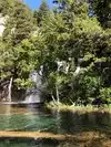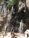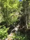This trail is about 1.8 miles long but it is up and steep. However, the reward is well worth it. At the top the trail splits into a Y. Go left a short way further to discover a nice waterfall that you can walk behind. Go back down the trail to the Y and go right. This is a wow factor. One will discover a small lake/pond size body of water created when the lake was located higher up the mountain and collapsed. Blue/green crystal clear water held in place by travertine dams.