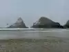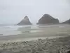 From Rte101 between Yachats and Florence a turn into the Hecata Head Lighthouse parking area brings you to beatiful Cape Creek Beach, set between 2 high bluffs with a wide beach, small rocks and mostly hard packed sand. There are 2 large triangular rock features just off the shore and a few shallow caves to explore as well. There are bathrooms, and a gift shop on the short walk to the lighthouse. The lighthouse was closed for renovations but park staff were available to provide information and answer questions.