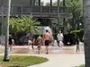 When the weather is warm enough, they turn on the fountain for the kids to splash in the water.