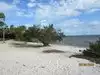 The beach is small, has trees for shade and the water is shallow. The sand is littered with twigs and leaves from the trees but if you put a beach blanket down it's not an issue. There's a beautiful sandy bottom once you are in the water. It's not the kind of beach that attracts young party crowds so it's great for kids.