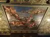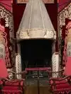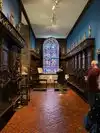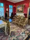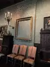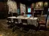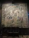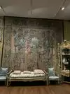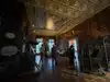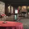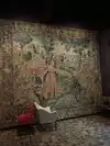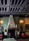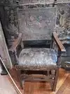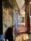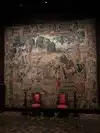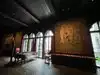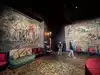 -Highly crafted chairs, coffered ceilings and a score of large tapestries.