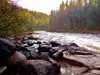 While this park does have a very nice campground with modern shower & toilet facility, the location just off the highway results in traffic noise, especially from trucks and motorcycles. However, the remoteness of the park means highway traffic levels are light in the daytime and extremely low after dark. The walk along the river trail back to the falls and Devil's Kettle is of moderate difficulty and worth the hike. A visit to the historical Naniboujou Lodge across the highway from the park is an easy walk and provides a place to get a meal in their beautiful dining room, or to shop the gift shop to gain access to their extensive private Lake Superior and Brule River frontage.