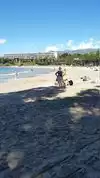 The playland of Mauna Kea Hotel guests, this beach is world class. Turtles swim in the water at day and Manta Rays at night. Spectacular sunsets year-round. Remember all Hawaiian beaches are open to the public including this one. We stayed at vrbo.com, no. 392796. The premise provided access ($25.00 per day) to this beach and the hotel through their website. Showers beachside are warm and inviting. Large beach, privacy is available.