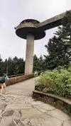 it's a tower on the Newfound Gap road, the trail is paved but it's rather steep, so there are some bench along the trail for people to take rest if needed. There are some information board on the tower, showing that what view you can see at that direction, however, there is always mist and cloud in smoky mountain, making it not very possible to see the view clearly, I don't think much good view or any impressive scenery can be seen there, but as the shape of the tower is quite special, so may be still worth to go there for once. There is also an information center/gift shop.
