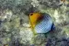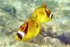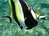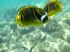 Oh man. I was in heaven. I swam in water about 8 feet deep that had amazing clarity I saw probably 30 - 40 different types of reef fish in less than an hour. In an area 10 feet by 10 feet you could see hundreds of fish. There were giant sized black and yellow Moorish Idols, masked Racoon Butterflyfish, needlelike blue Cornetfish, Blue Striped Butterfly Fish, brilliant turquoise fish that I think were Smalltrail Wrasse, 4-spot Butterfly Fish, the showy purple, orange and blue Saddle Wrasse, Yellowtail Wrasse, Whitespotted Puffers, striped Convict Tang and many other fish that I couldn't identify but were equally magical to watch.
