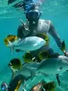 Fairly safe reef snorkeling for the family. Lots of tropical fish. Small beach but still worth it for the snorkeling and other activities.