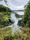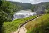 THIS IS NOW OPEN!!! It actually opened the day we visited on 7/16/20. About 2 miles downstream from the Upper Falls you'll find the lower falls. This isn't quite as accessible as the other two but you can get really close to this waterfall, enough to feel it's mist! This does require a moderate hike but is beyond worth it! Park at the octagon area for easiest access to the stairs that lead you to the lower falls, it's right behind the playground. You could park where the trail starts, it's mostly flat and shaded but there are a couple of stair cases to climb. Parking at the octagon area will save you 10 minutes each way off your trip! From the top of the stairs it is about 127 steps down and then back up but they aren't bad. Take a bottle of water to cool off after you've traversed back up it. Once you get to the very bottom of the steps, walk a little straight ahead to find the steps that lead you down to the footbridge. This can be hard to find if you aren't looking for it. The footbridge is a stone footbridge, the only one over the gorge that actually connects both sides of the park. After you're done visiting there, head back up to the main trail, where the original 127 steps ended and continue down the trail to get to the lower falls. From here it was a super easy and flat hike that did not take long to reach the falls. You'll see a meadow open up and the mist from the falls. You are close enough that you can cool off in the mist which is really awesome!!! I don't think the signs or markings for this trail is very well marked so it can be confusing to know if you are on the right trail. We were very lucky that a park ranger was on the trail and confirmed that we were going the right way. Once you're done visiting, turn around back down the path you came and back up the stairs to get back to the parking lot. At the lower recreation falls you'll also find a snack bar, plenty of picnic tables and playgrounds. At the octagon area you'll also find a nice playground and plenty of picnic tables.