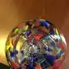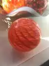 Following his instructions she carefully worked starting with clear glass and added colors; they pinched and twisted the heated combined glass and she slowly (under his helpful instruction) blew into the tube and watched the float grow. When finished, but still glowing glass hot it was placed into a kiln to slowly cool down over night.