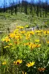 Beautiful yellow flowers are blooming where the fire swept through a couple of years ago. It is still a great place to hike and relax in nature. We've been trying to keep the trails clear and free from trees by volunteering with the Forest Service. Come visit!