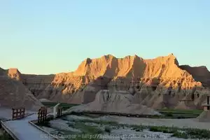 It has a small walking paved trail and other trails that lead you down the mountain. Old out buildings and monuments.