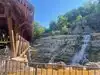 A jeep drawn wagon takes passengers along the trail and meanders through cool,verdant forests and streams. Streams are teeming with trout literally jumping all around you. Waterfalls and caves abound. There is a mill for lunch and a small cafe that serves coffee and such.