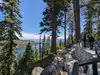 Get here early to park in the spots outside the trailhead parking (free, or park in lot for $5). Pick up a Desolation Wilderness day hike pass (free) at the trailhead from the wooden box on the left of the sign before you begin. Lots of stone steps and well-maintained trail that goes about 1.5 miles one way. You can hike from Vikingsholm as well. Shady in spots, lots of hikers.