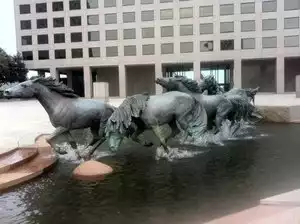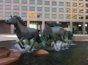 Beautiful sculptures of mustangs running into a stream. Free. Located in front of an office building.