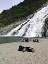 This is an easy, flat walk (about 12 min at a brisk pace) to the base of Nugget Falls. The falls are powerful and loud; you can really appreciate it at the end of the walk -- be sure to go out on the beach at the end of the trail for better views of the falls and glacier.