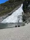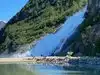 These thundering falls move massive volumes of water by the side of a pebbly, shore. Enjoy the fine mist spray and the view of the glacier!