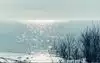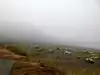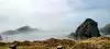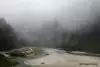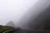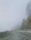 The fog creeps along the shore, across the highway and up the mountains with cracks of sunlight seeping through.