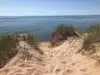 This beautiful beach is a gem and everyone knows it. It was extremely crowded on an August weekend. Now 10$ a day for parking and we got the last spot. Go to the right where there is a boardwalk to help you up and down steep dunes to water. We came back at sunset and they weren’t charging for parking. Lovely spot to see end of day.