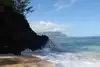 Close to Princeville resort accessible via a beaten path and about 100 meters downhill slippery muddy hike down a hill (only a rope for support) Down hill is very treacherous uphill climb is easy.