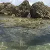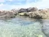 There is a rocked areas surrounded a large lagoon for snorkeling .