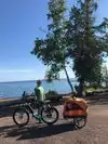 My wife and I rode our bikes to Presque Isle from our homeaway with our two puppies in tow in a trailer. It took about 15 minutes to get there. Once we got there we saw that dogs had to stay in enclosed vehicles. That eliminated the possibility of getting them out for exercise at any of the lookout points. We went on a Saturday morning when motor vehicles weren’t allowed. Made for a quiet ride. It was morning so the sun was to our disadvantage over the east side anyway. So we kept going. We made a stop on the west side about 3/4 the way through. We enjoyed watching the waves lap against the rocks. With a 10 minute stop for pictures and wading, it took about a half hour to get around the island. A few hills but not strenuous. Afterwards we took our dogs to an unofficial beach where there weren’t any “no dogs allowed” signs. (South beach in Marquette allows dogs).