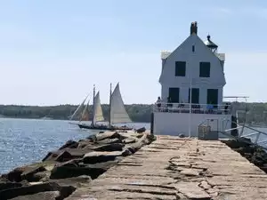 The Rockland Breakwater Lighthouse is a wonderful experience. It is located just a short drive outside of Rockland. There is a small parking area and park along the water for those not wanting to take the long walk out to the lighthouse. There were no fees. It's just under a mile walk on the rugged granite breakwater to the lighthouse. Once there, take in the fresh sea air, the beautiful views of passing ships/sailboats and the lovely coastline. You can walk around and sit at the lighthouse, but cannot enter the building. There are prettier and more iconic Maine lighthouses, but the walk and views make this lighthouse a special experience. Would definitely recommend.
